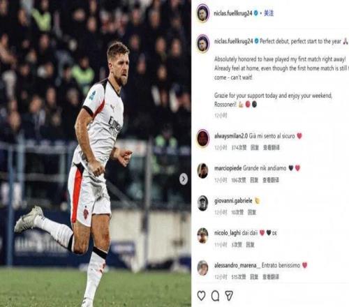 米兰圈米兰在本轮意甲1-0卡利亚里,新援中锋菲尔克鲁格替补完成首秀。他也在赛后通过社媒发文纪念:“完美的首秀,完美的新年开局 非常荣幸能立刻上演我的处子秀!虽然第一个主场比
